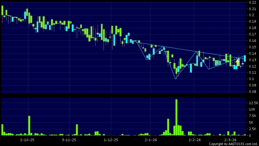 XINKONG INT CAP(00993.HK) appears an upside breakout, rose above the neckline. Last printed at 0.137; rose 9.600%; on volume of 431.00K shares and turnover of $57.04KRecent Perform...
