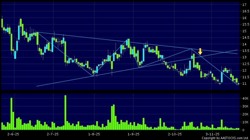 Triangle Breakout means the volatility of price movement is decreasing, stock price finally broke the bottom of triangle. A downward trend will start.(HK stocks quote is delayed for at least 15 mins.Short Selling Data as at 2025-12-12 16:25.)